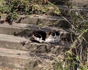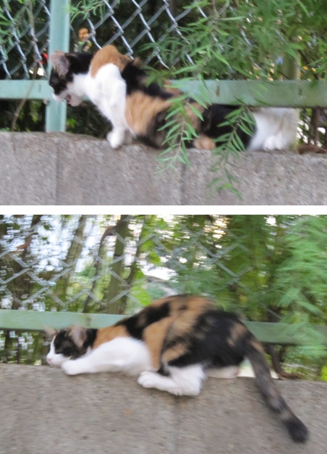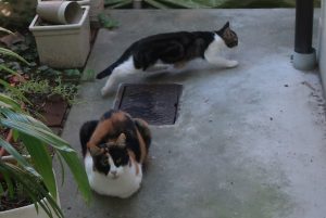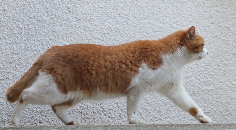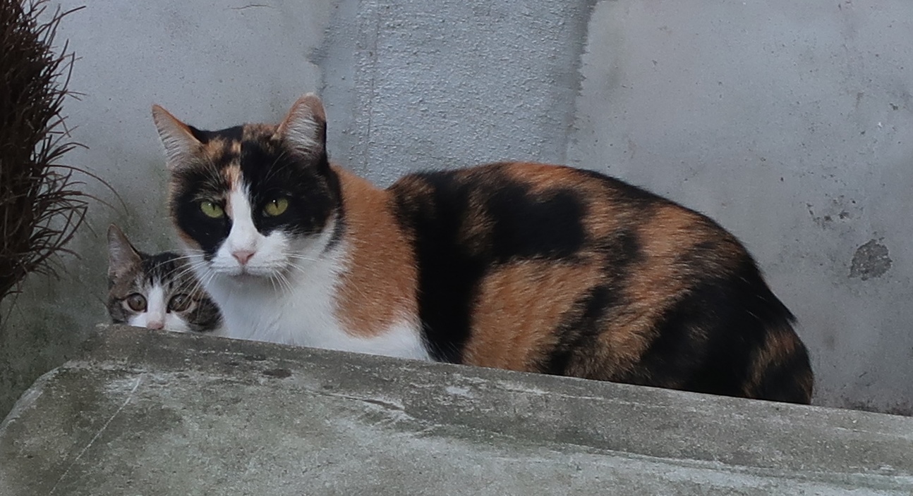 その後も時々見かけますが、元気そうです。つい最近(2025年1月)も、裏庭の塀の上をチャシロがチビを追いかけていくのを目撃しました。今はチビも体力の付いた太めのネコになっていますので、あまり必死さはなく、「追われ慣れ?」しているように見えました。
