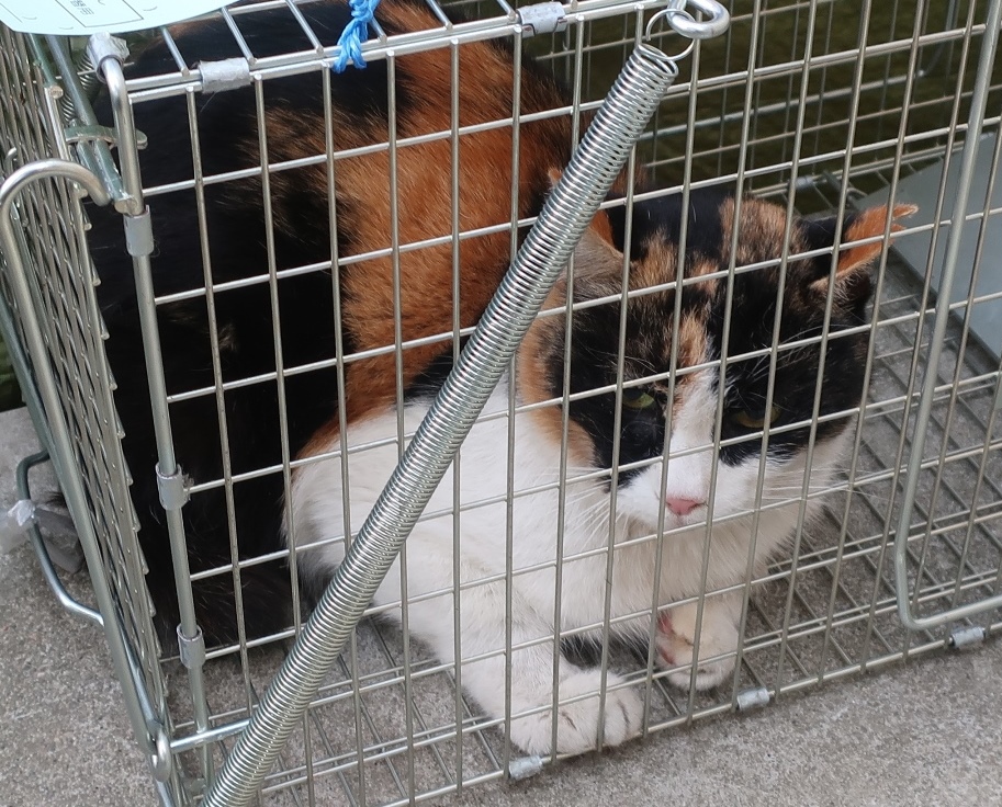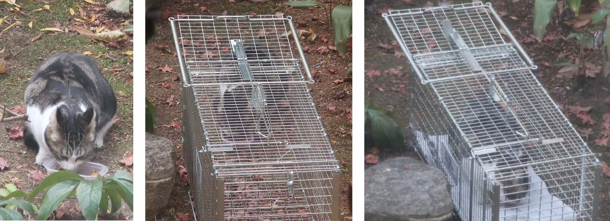 2020年12月頃から、チビはほぼ毎日、庭に現れて食事をするようになったので、TNRを計画しました。2021年1月になって、捕獲器を庭に置いたままにして、食事プレートを徐々に捕獲器に近づけていきました。最後は捕獲器の中にプレート入れて2日目(2021年1月14日)にチビを捕獲しました。