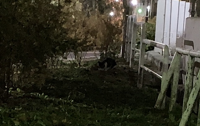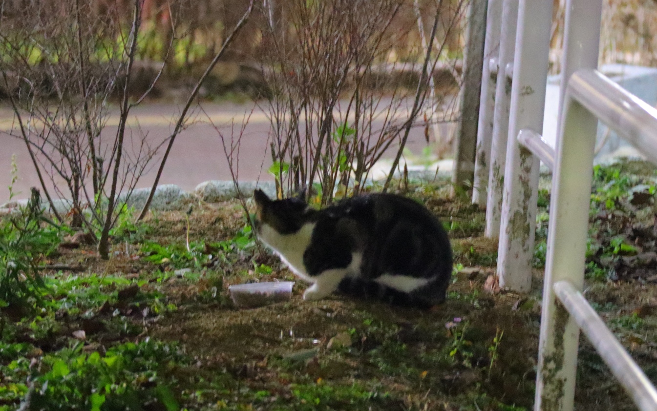 チビは昨年(2024年)7月9日の夜に現れて後、次に現れたのが2週間後の24日の夜でした。空腹ではあったようですが、その2週間、何も食べなかったというような雰囲気はありません。これまでも、数日から1週間ほど現れないことがあったので、どこか別宅(本宅?)か餌やりさんから食事をもらっているのは明らかです。ずっと通いですから、寝場所はどこかにあるはずです。