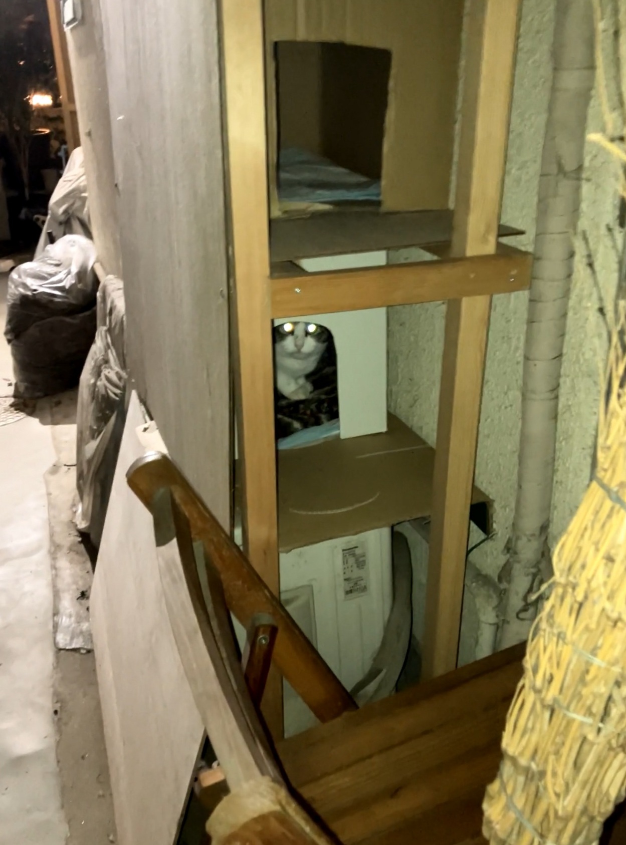 今年(2025年)1月末になり、寒くなってきて、チビが拙宅の横通路に置いた猫小屋で泊まって、朝帰りする日が続いています。