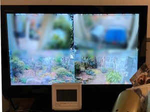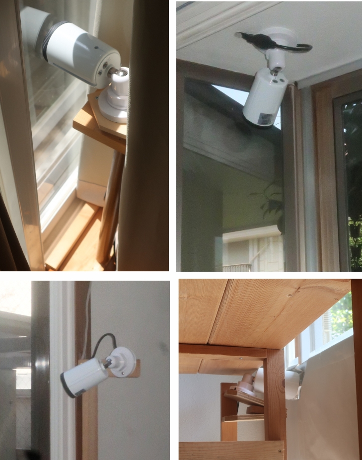 2021年5月、チビがいつ来るかを窓から眺めてチェックするのは大変なので、模型鉄道レイアウトに使っていた(=あまり使わなかった)監視カメラ(4台組)を窓の内側にセットして、部屋の中でモニターできるようにしました。すべてLANケーブルで接続していて、モニター画面の動画映像は録画できます。防犯カメラとしても有効かもしれません。