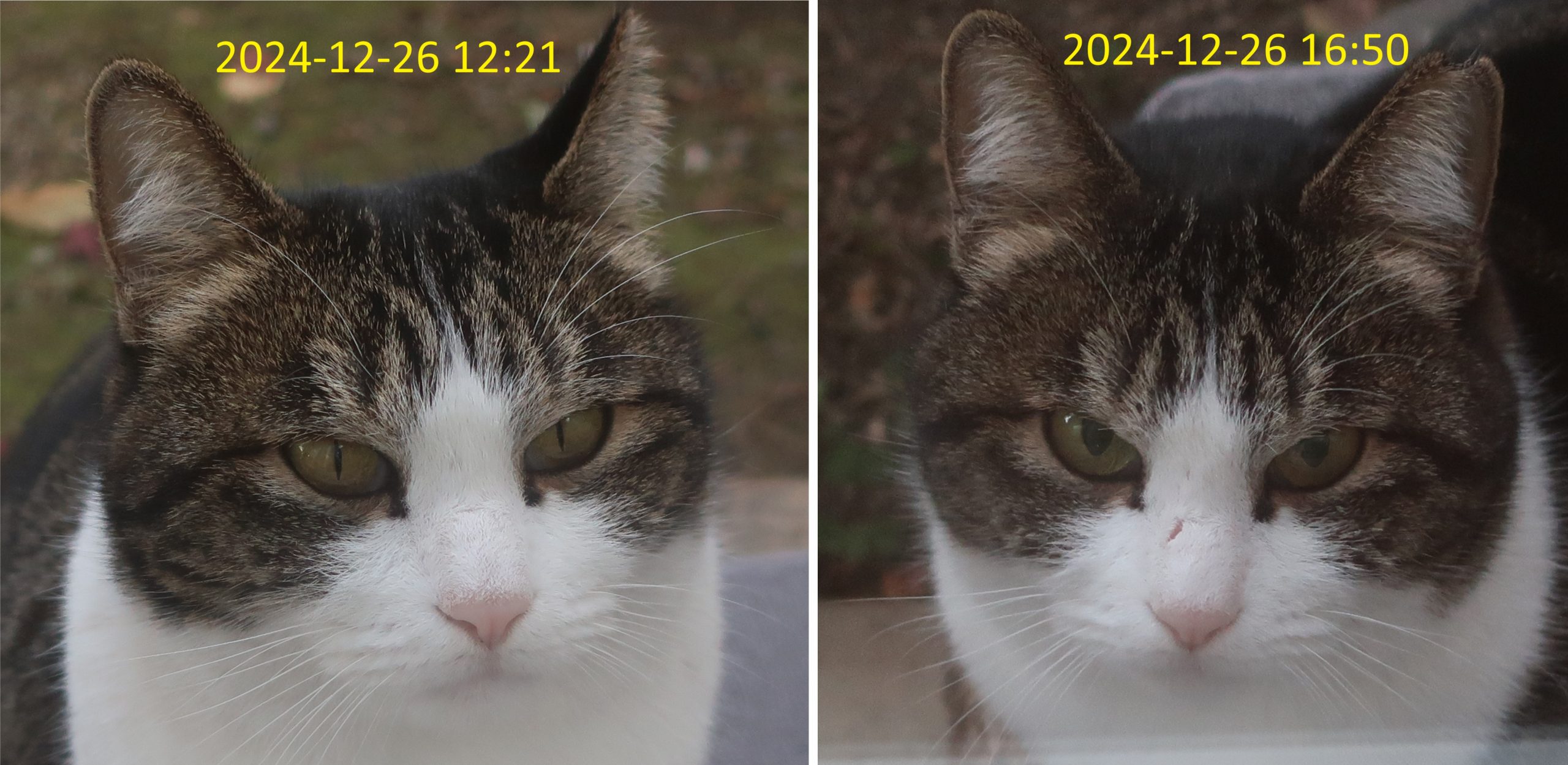 2024年12月26日、鼻筋に傷ができました。12時21分に撮影した写真では無し、16時50分の写真で小さな傷ができています。皮膚に傷が付いているようにはみえませんが、額だったら、懐かしの早乙女主水之介(旗本退屈男)みたいです。女の子だけど。