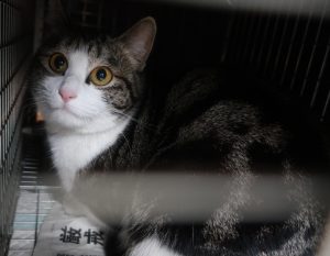 捕獲器の中のチビです。とってもきれいな若猫です。