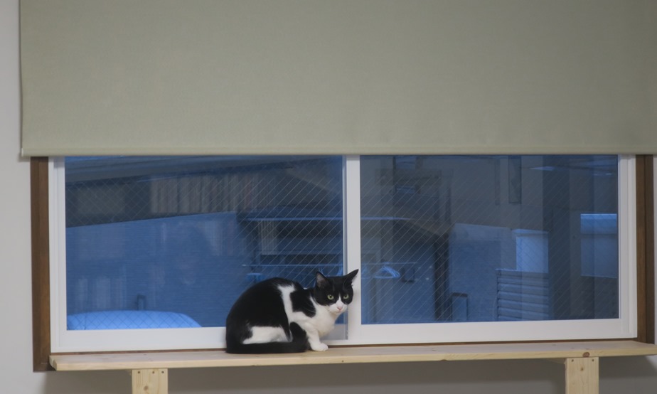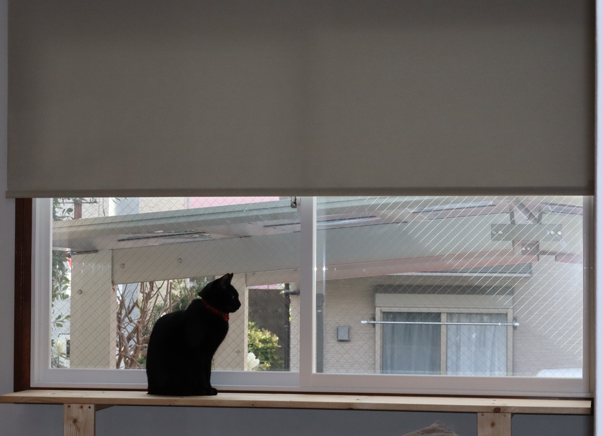 そこで、アイがいなくなって解体した猫部屋フェンスを玄関ホールに小さくまとめて、猫部屋を作りました。