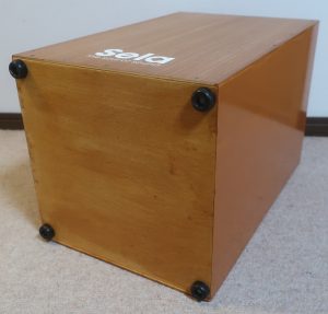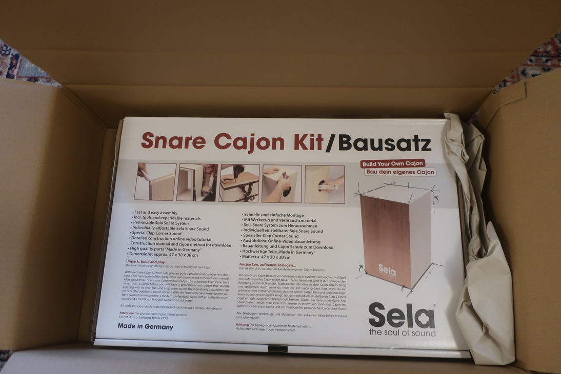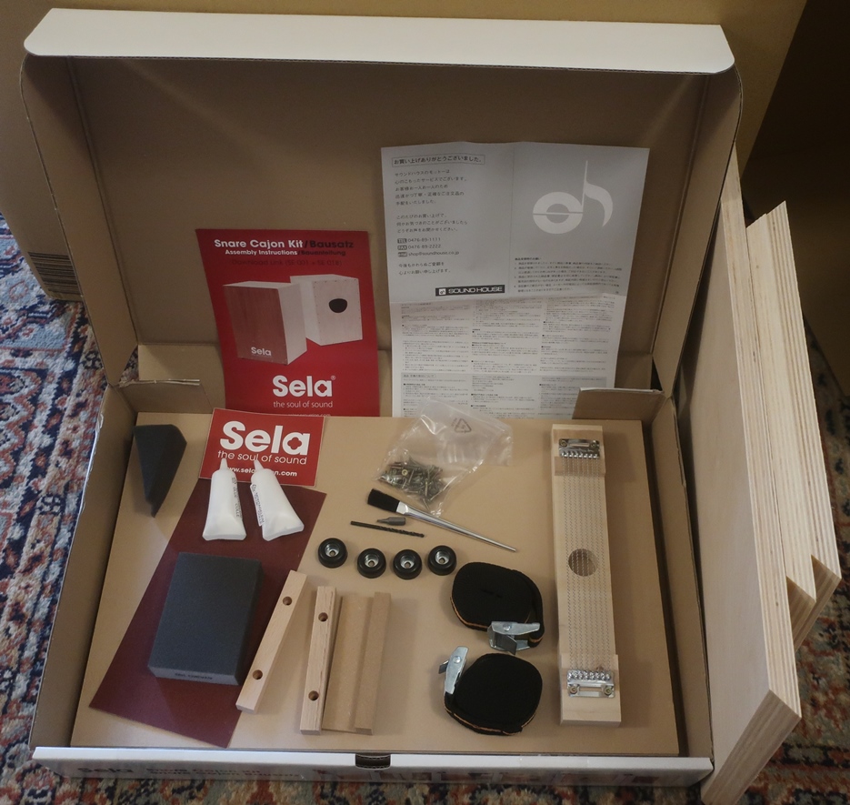 開けます。ドイツのSelaという打楽器メーカーの製品(Snare Cajon Kit)です。
