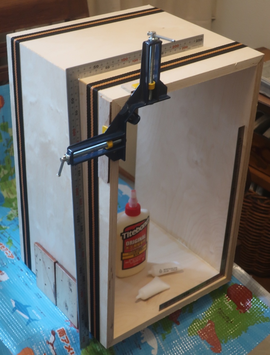 翌日、先ずは外板を4枚合わせて箱を作るために、添付の2本の小さなチューブ入り接着剤を使います。ところが、一カ所の接着だけで、1本が無くなってしまう(使いすぎ?)し、あまり上等な接着剤ではなさそうだったので、手持ちのタイトボンドを使いました。次の写真で、タイトボンドの前にある白いチューブ2つが添付されていた接着剤です。