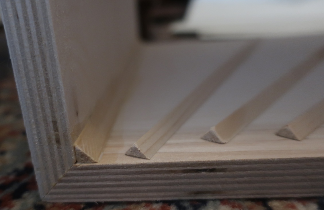 ただ、カホンは上に座って叩くので、体重がたっぷりかかります。前後に薄い板を貼るからいいのだろうとは思いますが、45度で合わせた板を接着剤で固定するだけでは心許ない雰囲気を感じたので、手持ちの工作用三角棒を4隅に貼り付けることにしました。これは思いつきの補強です。