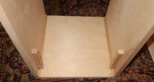 しかし、前板だけが塗装された状態は感心しませんので、3日目から塗装に入りました。白木のままの4面ならびに底面も塗装します。塗料は、手持ちで残っていた、水性ウレタンニスのライトオークです。