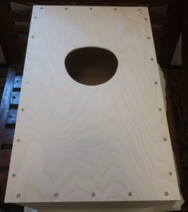 後でカホンの画像をネット上で調べてみたら、前面上部の左右をねじ止めしている場合が多いようですが、このキットのように、この場所にねじ止めしていないカホンもそれなりに見かけました。カホン作りに慣れていれば、音を聴きながら、ねじ止めの位置と数を決めるのかもしれません。まあ、ビギナーはこれでいいことにします。