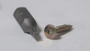 添付されているねじは、径2.8mm長さ15mmです。木ねじなのに、いたずら防止のために自動車用部品でよく見るトルクスヘッド(六角星形のヘッド)でした。写真左側の電動ドライバーのトルクス用六角ビットも添付されていました。