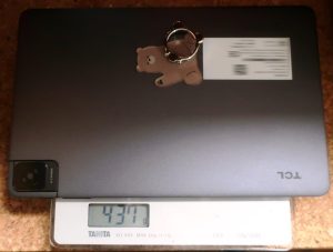 本体を触ってみて、しっかり作られているのがわかります。ただ、ケースに入れていないと、滑って落としそうだし、持ちにくい、ということで、近所の百均でスマホ用の指リングを買ってきて、裏に貼っておきました。あまり丈夫ではありませんが、指がひっかかるので、それなりに安定します。これで13g増えて、437gになりました。