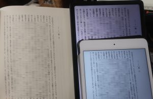 別の本(縦19.5cm・横13.5cm)ですが、左のTCLと右の9.7インチの(miniではない)iPadでは、縦長のTCLのほうが、iPadよりもページの文字面をうまく囲むことができて、その分、文字が拡大されて読みやすくなりました。