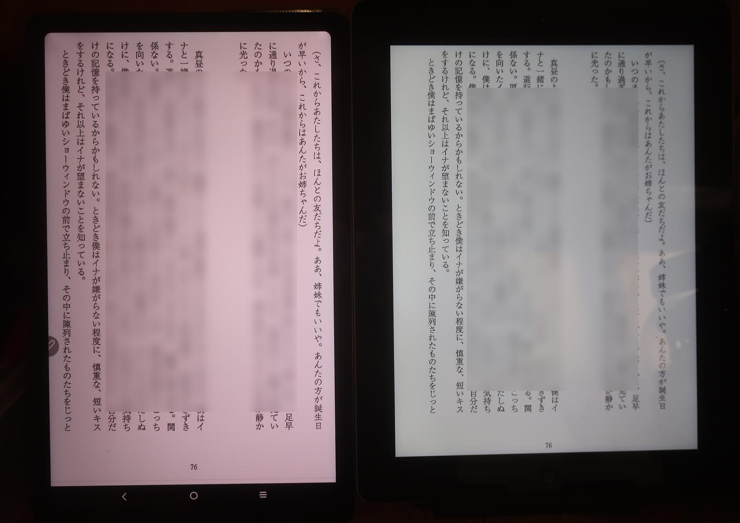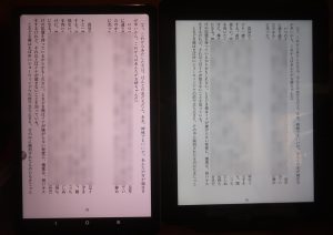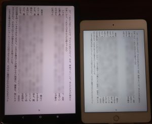 最後に、TCL(左)と、これまで持ち歩いていたiPad mini(右)との画面を比べておきます。これだけ拡大されるととても読みやすくなりました。