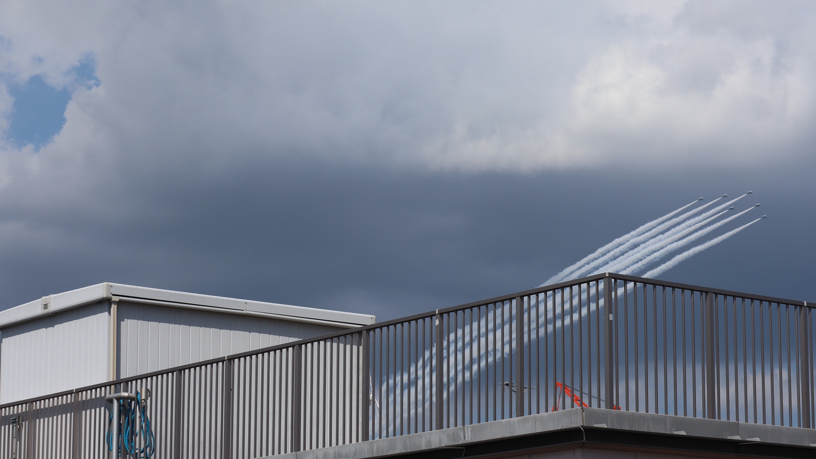 その後、7月12日の展示飛行初日に5番機から撮影された映像がYouTubeにアップされました。とても迫力ある360度の映像で、しかも、上記写真の撮影場所が写っていたので、静止画にして使わせてもらいました。この写真に入れた黄色の○あたりが翌13日に撮影した場所になります。12日は、このあたりではスモークを出していませんでした。