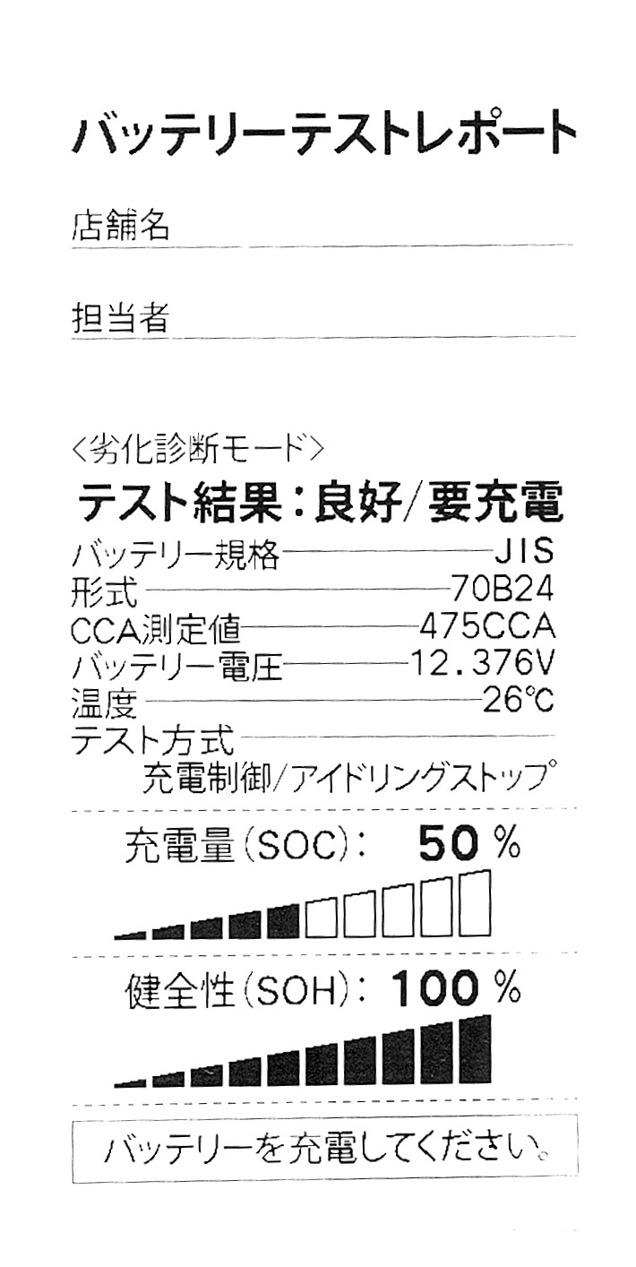 これを見ると、健全性(SOH:State of Health)は100%なのですが、充電量(SOC:State of Charge)が50%しかないので、「充電してください」というメッセージが印刷されています。内燃エンジン車の始動能力をあらわすCCA(Cold Cranking Ampere)測定値は475で、このバッテリーの規格は495なので、少しだけ下がっています。