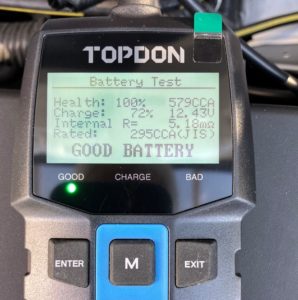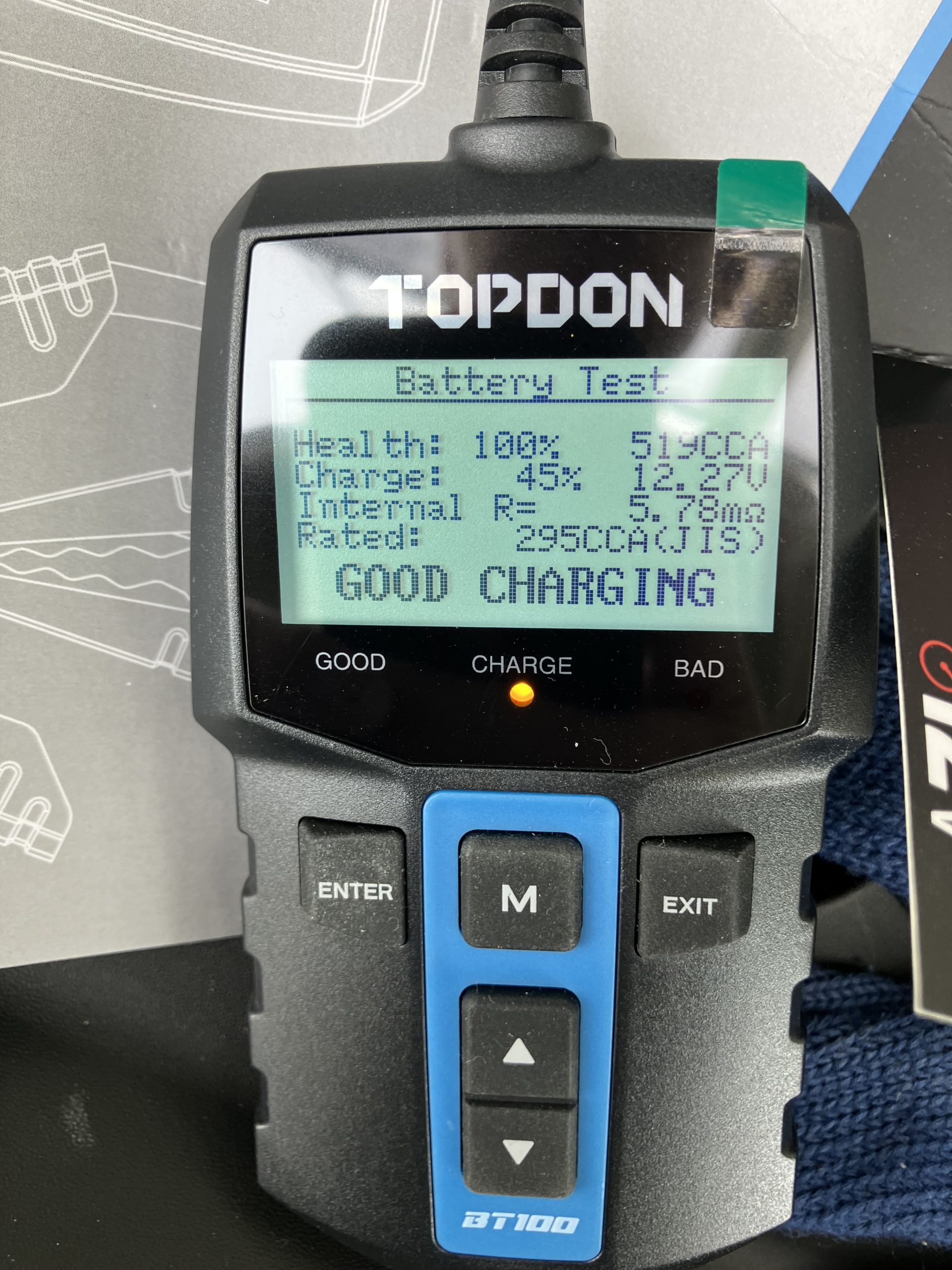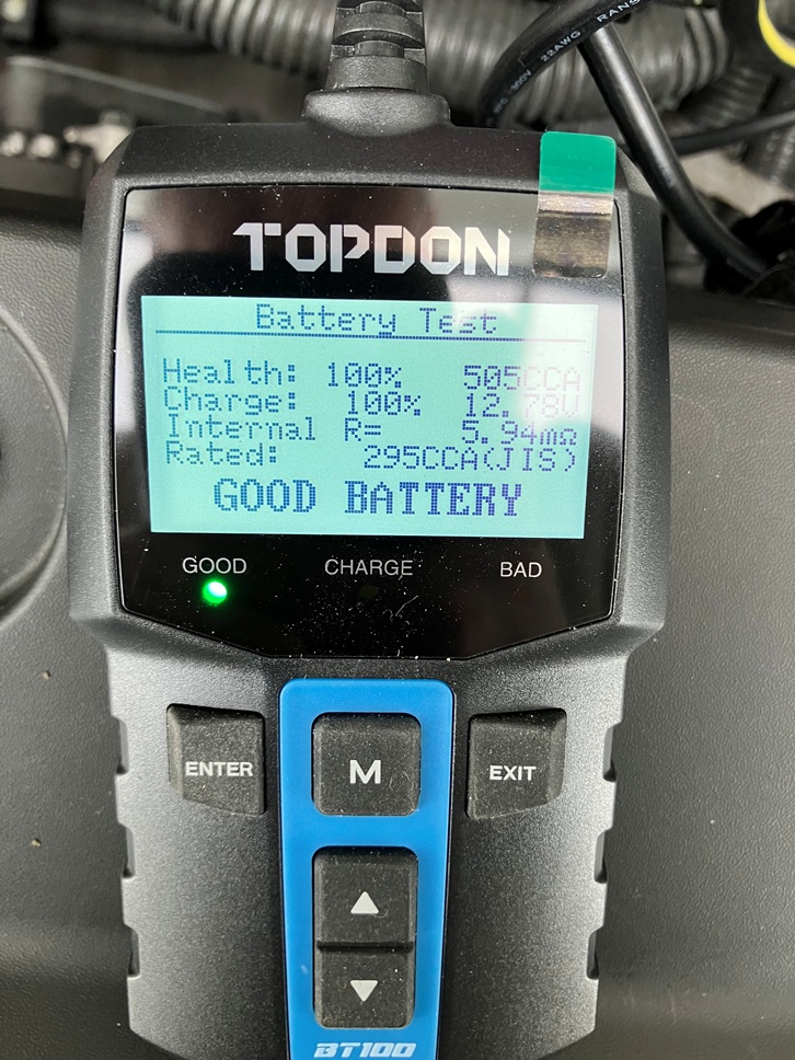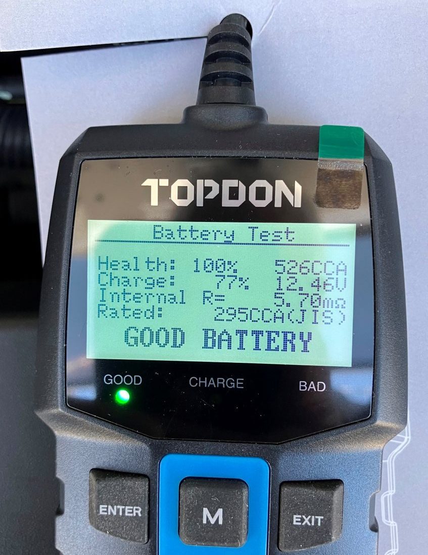 先ずは、補機バッテリーの状態を手持ちのバッテリーチェッカー(TOPDONのBT100)で調べました。該当するバッテリーの型番データがBT100に入ってなかったので、型番規格の正確な数値はわかりませんが、基本測定結果に大きな違いはありません。