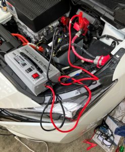リーフの充電方法を調べた結果を要約すると、スターターボタンを押すと、補機バッテリーの電圧をチェックして充電を始めるようです。それはシガーソケットでの電圧チェックをすると、スタート時に14.3V程度となり、しばらくして12V台まで下がって、その後の変化はなくなります。