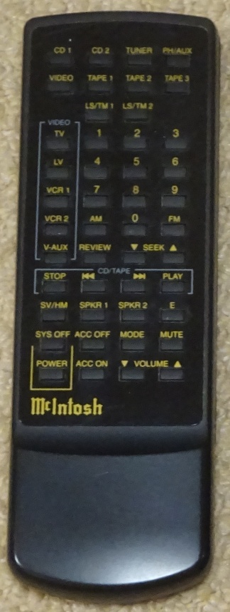 とってもちゃちっぽいですが、このリモコンはSONYの学習リモコンに学習させるだけなので気になりません。McIntosh専用リモコンなので、シールを貼っておきました。