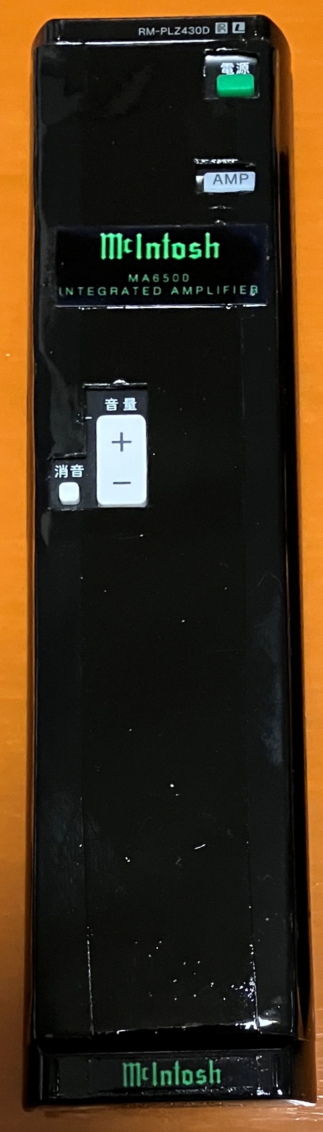 ミニPC導入後、McIntoshアンプの使用頻度が上がり、アンプを簡単に操作したくなったので、小さな簡易版学習リモコン(ボタンが6個だけ)をAmazonで購入(800円ほど)して、MA6500のON/OFF、信号入力経路、LOUDNESS、音量UP/DOWN、MUTEを登録し、自作シールを貼りました。