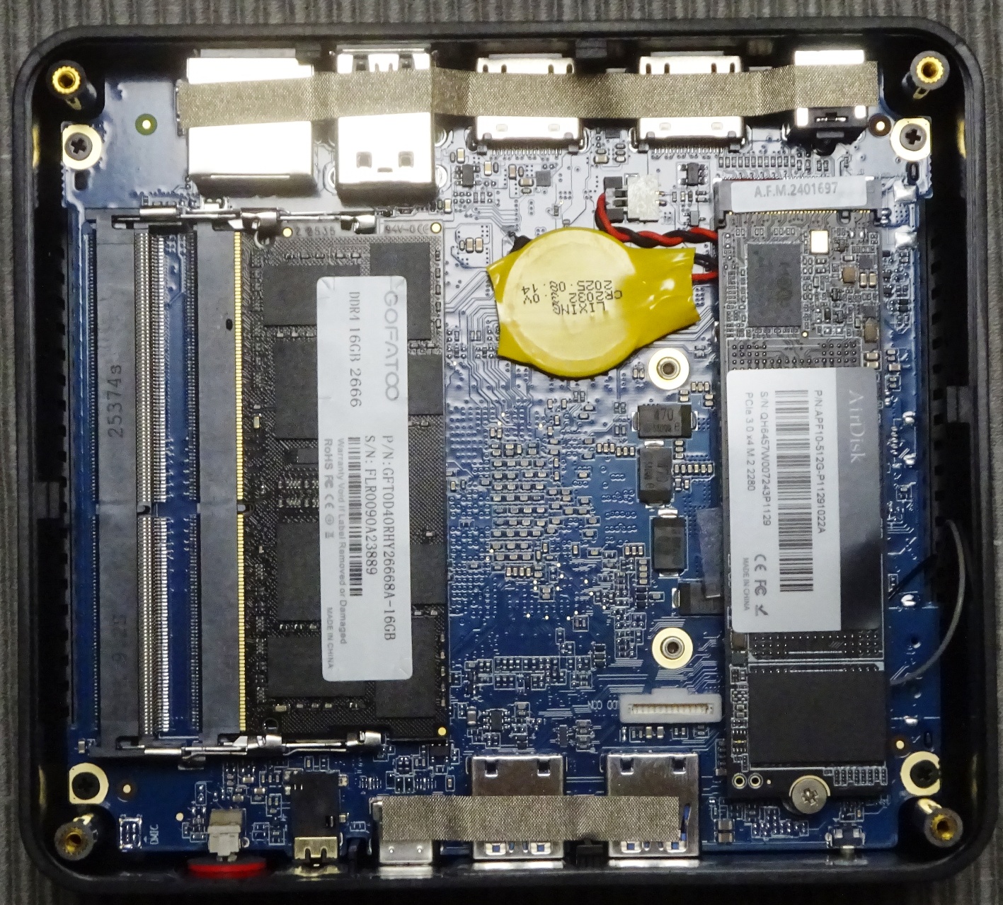 裏蓋を開けると、こんな感じです。中央に2.5インチSATAのSSDが入れられるようです。ボタン電池CR2023(中国の規格? CR2032あたりと互換らしい)の交換が少し手間のようです。