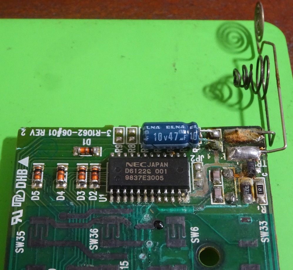 今回、あらためてオリジナルのリモコンの裏蓋を開けてみました。内部の腐食は思った以上にひどいものでした。