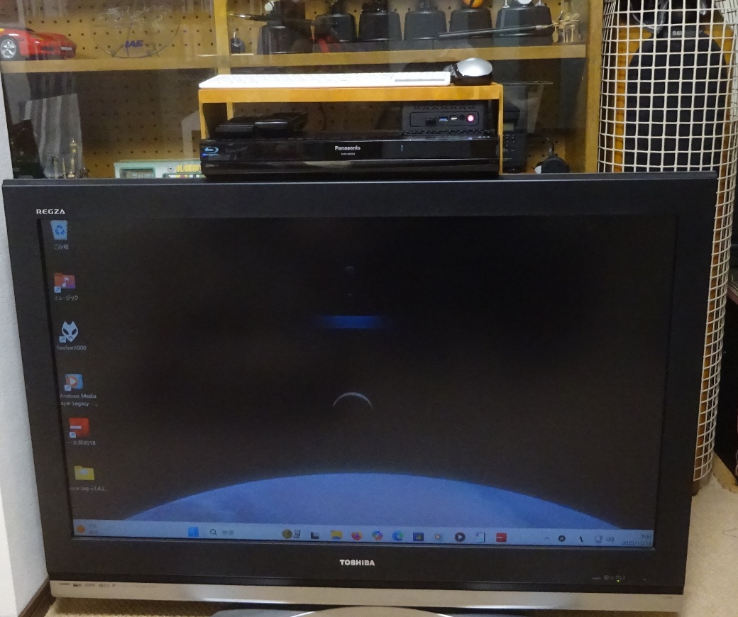 古いテレビ(2006年製のREGZA Z2000 42インチ)の上にBDレコーダー、その上にミニPCを置きました。ミニPCはHDMIケーブルでテレビにつながっています。Windows11が無事に立ち上がって、好みの仕様に調整しました。