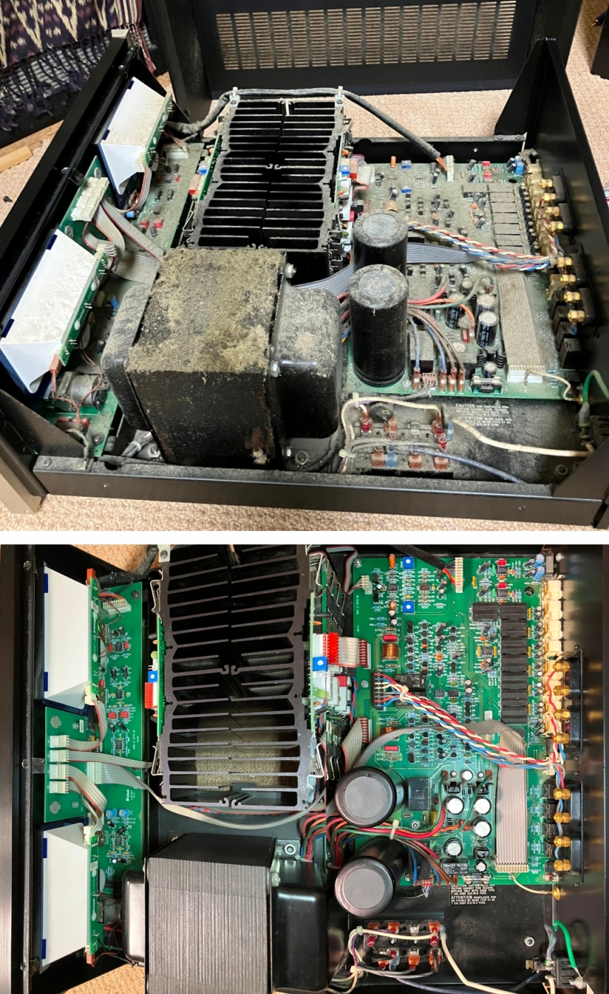 ひょっとしたら、2001年に購入してから四半世紀、カバーを開けたのは初めてかもしれません。音に問題がなかったのが不思議なくらいすごいホコリでした。写真の上が掃除前、下が掃除後です。掃除後の写真は全体を取り忘れたので、左右半分ずつの写を合成しました。