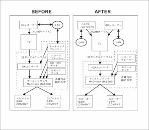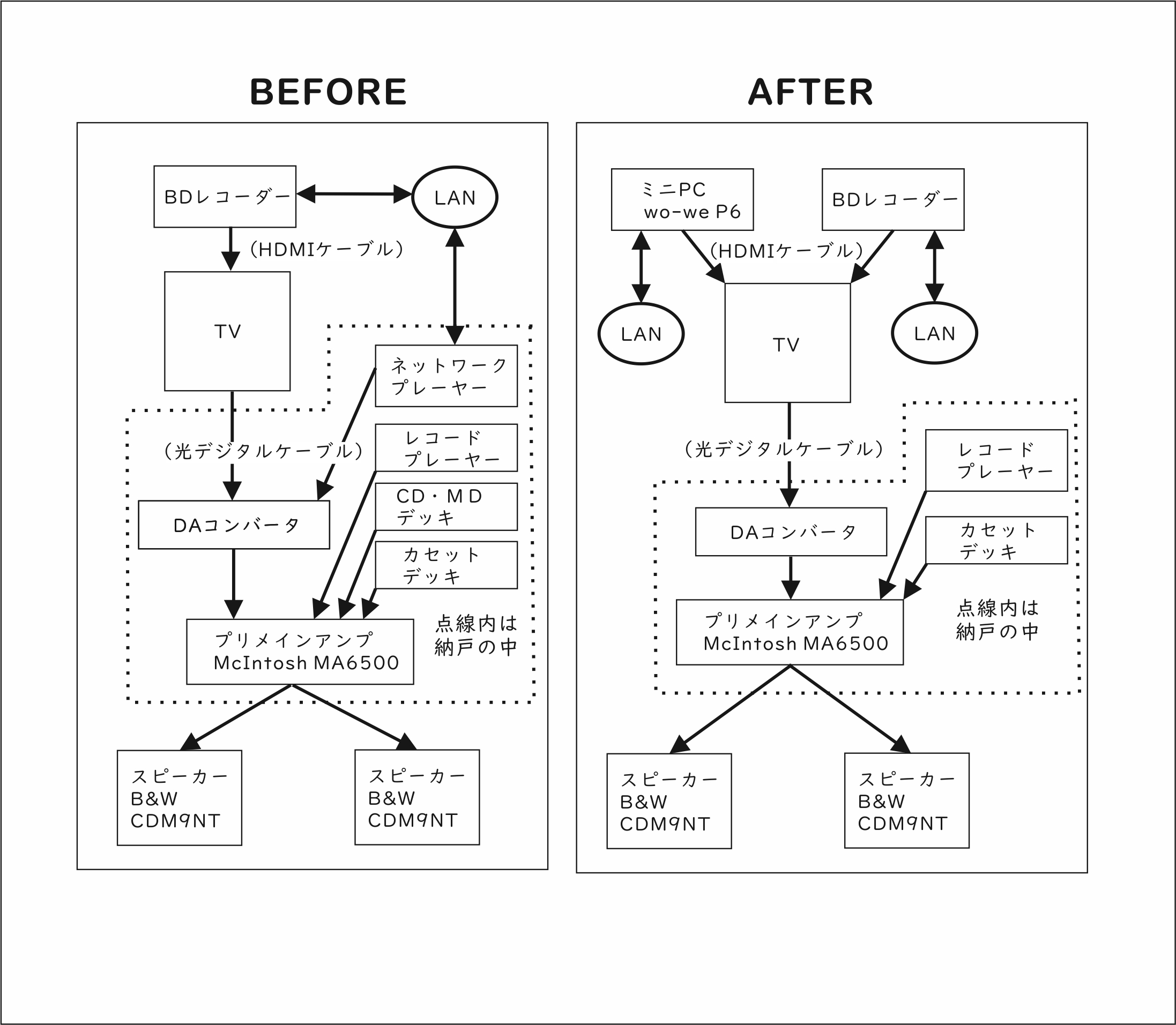 さて、ミニPCを導入することで、オーディオシステムの構成を次のように変えました。