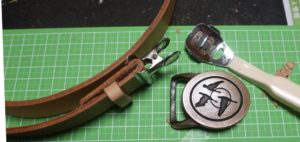 レザークラフトは亡くなった義母の趣味で、材料や工具がたくさん残されています。その中にベルト用の皮革もあったので、バックルに合わせたベルト作りを入門作業としました。
