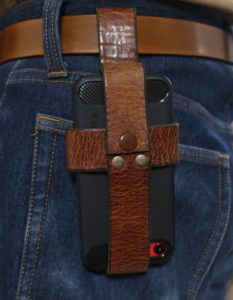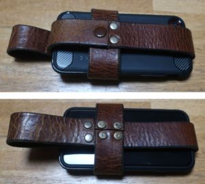 この方式の弱点を挙げれば、トイレなどでバックルを外すとスマホの重みでベルトごとスルリとホルスターが床に滑り落ちることがあるので、注意が必要なことでしょうか。ベルトにホックで留める方法も考えましたが、バックルを外す時はホルスターを後ろポケットに入れると問題ありません。