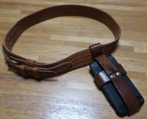 その一方で、普段使いのベルト(3cm幅)が穴1つ分ほど短くなっている(胴囲が延びている)こと、ベルトの革もくたびれていること、バックルは好みであること、などから、この古いベルトでスマホのホルダーを作ってみようと思い立ちました。