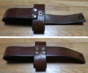 ということで、レザークラフト入門の始まりです。余っていた革でベルト装着用の帯を元の帯の上に取り付けてみました。ポンチで穴を開けて、2つのカシメで固定しました。カシメの内側には薄い革を貼っています。