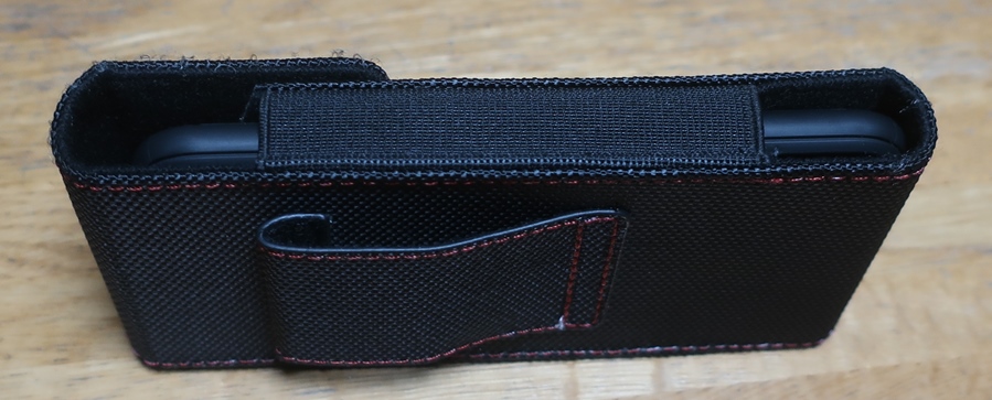 フラップが磁石による接着なので、開閉はとても軽くていいのですが、少し縦に長く(1.5cmほど)、そして一番の問題はベルト装着の帯が真ん中に付いていることでした。1週間ほど使ってみてわかったことですが、スマホが数センチほどベルトより上になってしまいます。スマホを取り出すために肩と肘を大きく曲げなくてはなりません。