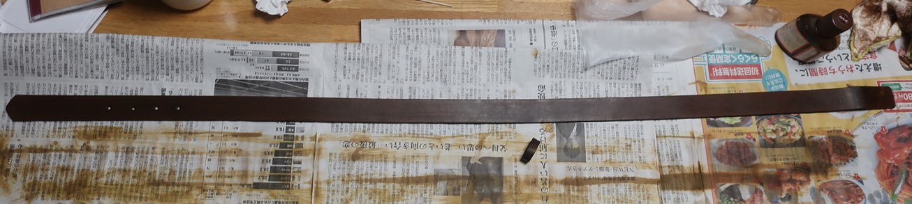 ベルト作りはわりと簡単でした。現在の胴囲に合った長さに切ってから、水で濡らして染色し、革の切り口(コバ)の処理、コーティングによる仕上げ、などです。この写真は染色が終わった状態で、乾くまで一晩かかりました。
