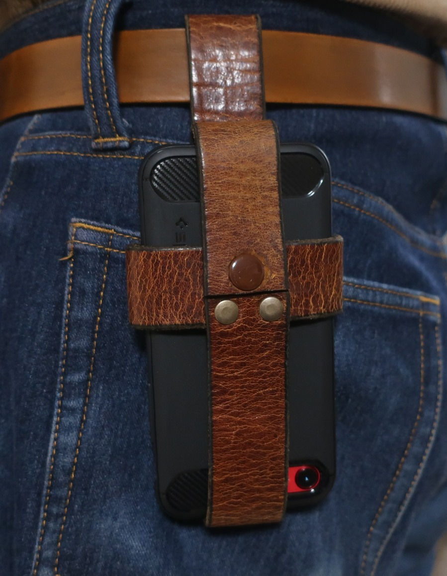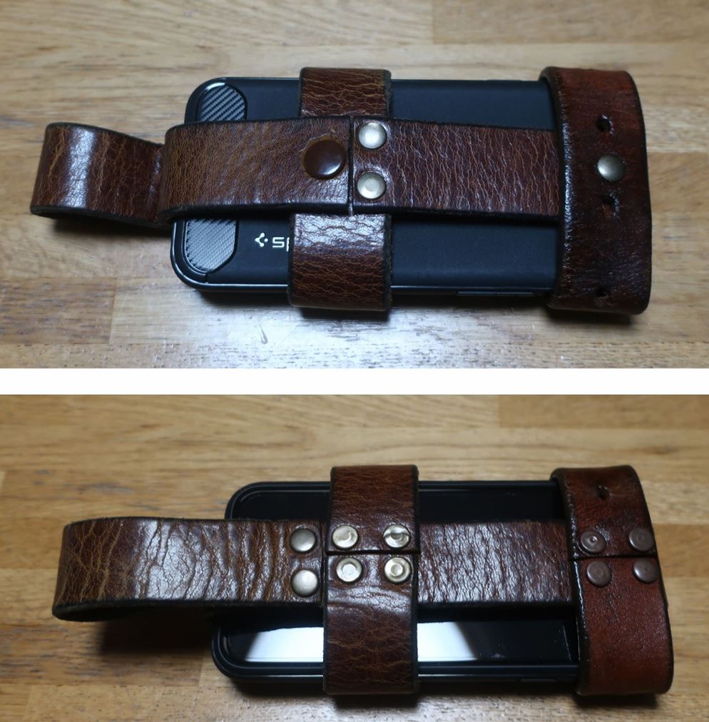 これでスマホがベルトより下になり、スマホの出し入れがずっと楽になりました。ただ、革が薄くて柔らかすぎるので、厚い革でやり直してみたくなりました。