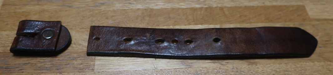 ベルトの残っていた部分を下側に後付けしました。バックル用の穴が見えるのはご愛敬ですが、このあたりはヨレヨレになっていたので、使っていませんでした。かなりの色づけなどで合わせてみました。