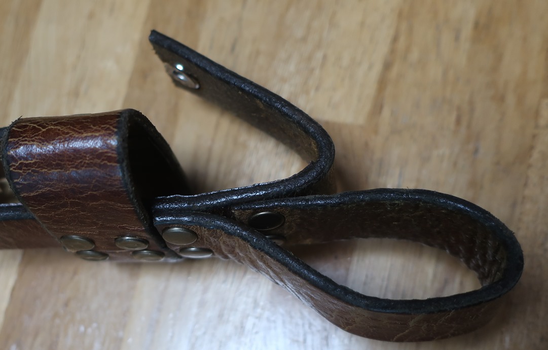 ということで、レザークラフト入門の始まりです。余っていた革でベルト装着用の帯を元の帯の上に取り付けてみました。ポンチで穴を開けて、2つのカシメで固定しました。カシメの内側には薄い革を貼っています。
