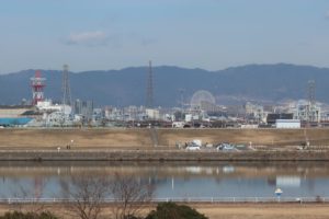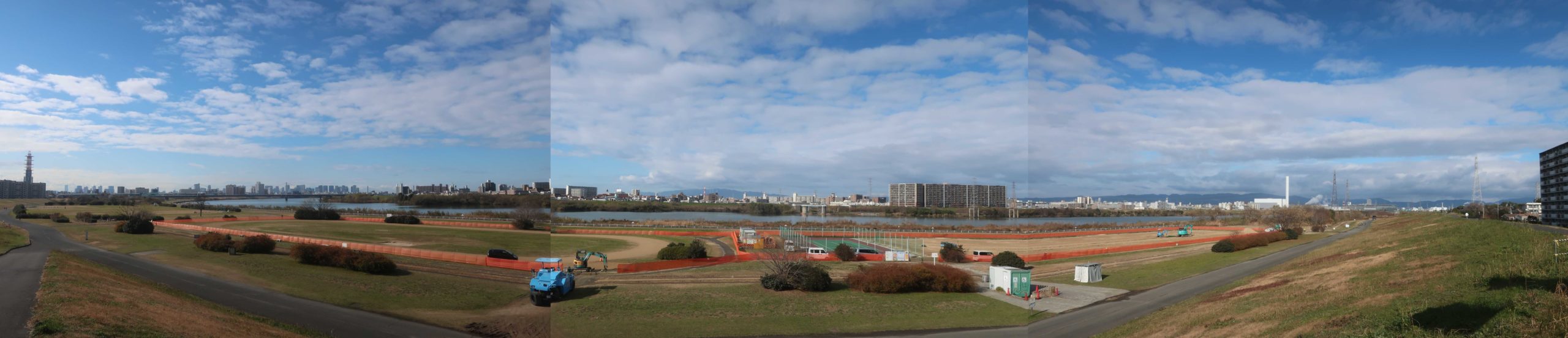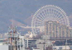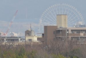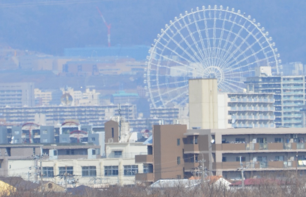 今年になって、観覧車の左後方には太陽の塔があるけれど、はたして淀川の高水敷あるいは堤防上から見えているのかが気になりました。太陽の塔は高さが70mで、観覧車の半分くらいです。観覧車の上半分が見えているなら、太陽の塔の顔が少し見えている可能性があります。