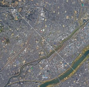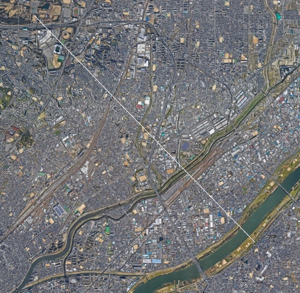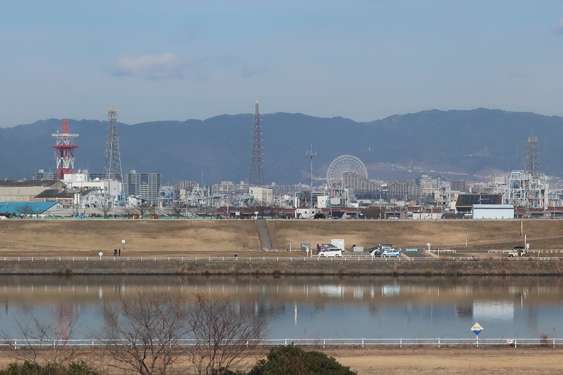 直線距離は6kmくらいです。このあたりから上流になると観覧車と太陽の塔が重なってしまいます。