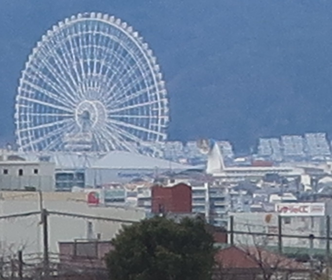 肉眼では観覧車しか見えません。重いですが、300ミリの望遠レンズを付けたカメラで何カ所かで撮影してみました。すると、2か所で太陽の塔を撮影することができました。