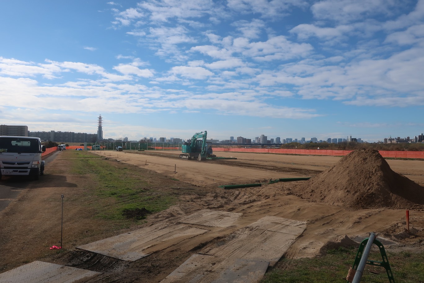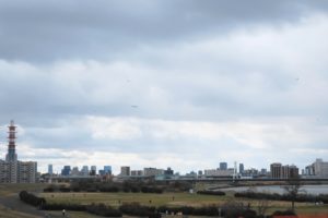 その後(3月17日)、同じ方向で、堤防下の高水敷(歩道や運動施設のある河川敷)からも撮影することができました。顔だけが工事用クレーンの下、建物の上に小さく見えています。