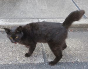 ガレージから出て行く姿を見て、鍵々しっぽのアイとそっくりで驚きました。色は黒茶で、アイより尻尾の毛が多くて太く見えます。雌猫です。
