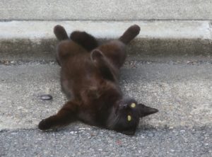 4月に入ってほぼ毎日、近所でゴロゴロしていて、桜が散り始めて、落ちてくる花びらで遊ぶ姿が印象的な可愛さでした。とっても人なつっこく、ニャーと鳴いて近づいてきますので、下校時の子どもたちには大人気となっています。