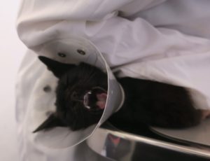 いつもの動物病院で診てもらいました。この子は人慣れしているけれど受診慣れはしていないようで、検査のための血液採取の際の保定では大暴れ・大泣きで、カラーを付けられました。まあ、泣いている姿も可愛いですが。