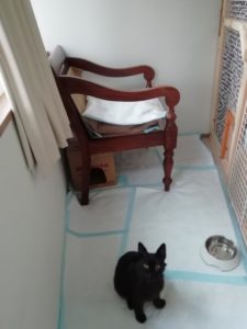 そこで、アイがいなくなって解体した猫部屋フェンスを玄関ホールに小さくまとめて、猫部屋を作りました。