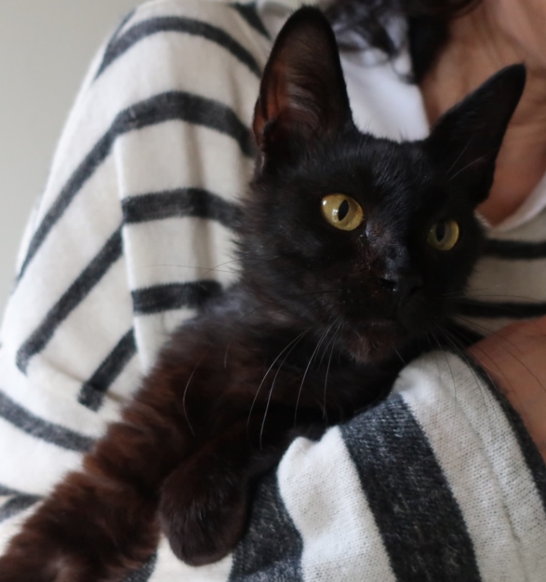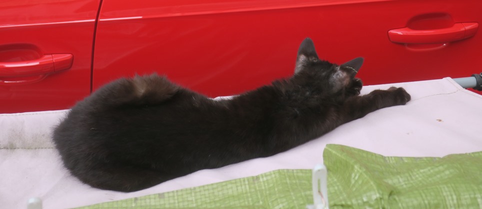 2019年3月、アイの里親候補さんが面会にいらっしゃった頃、ガレージの自転車カバー屋根の上に小柄な黒猫が昼寝していました。まだ生後6カ月くらいの野良猫です。