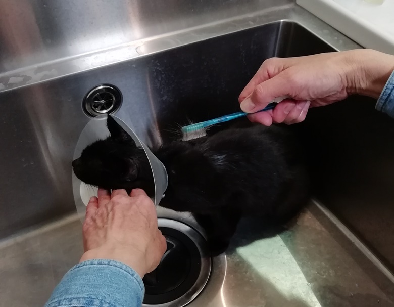 週に2回、耳を薬用シャンプー(マラセブ・シャンプー)でモミ洗いして、10分ほど待つので、その間、歯ブラシで毛を梳きます。