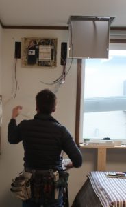 ネット上では太陽光発電システム用に買電と売電の2台のメーターが並んでいる写真を多く見かけましたが、すでにスマートメーターに変わっていたので、メーターの下側のブロックを双方向用のブロックに取り替えるだけで、配線はそのままです。作業中に停電しないようにバイパス回路をはめ込み、10分ほどで工事完了となりました。