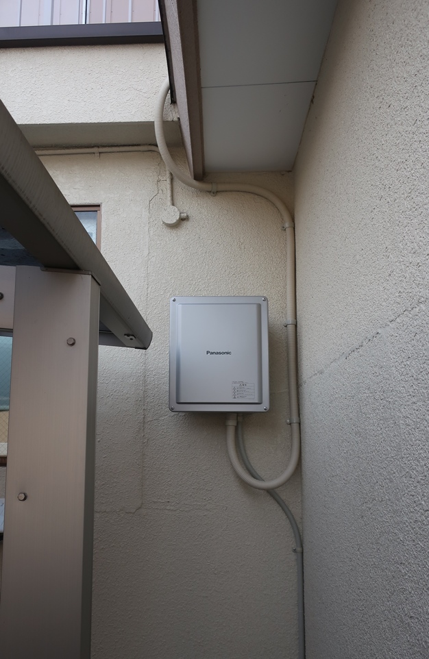 ネット上では太陽光発電システム用に買電と売電の2台のメーターが並んでいる写真を多く見かけましたが、すでにスマートメーターに変わっていたので、メーターの下側のブロックを双方向用のブロックに取り替えるだけで、配線はそのままです。作業中に停電しないようにバイパス回路をはめ込み、10分ほどで工事完了となりました。