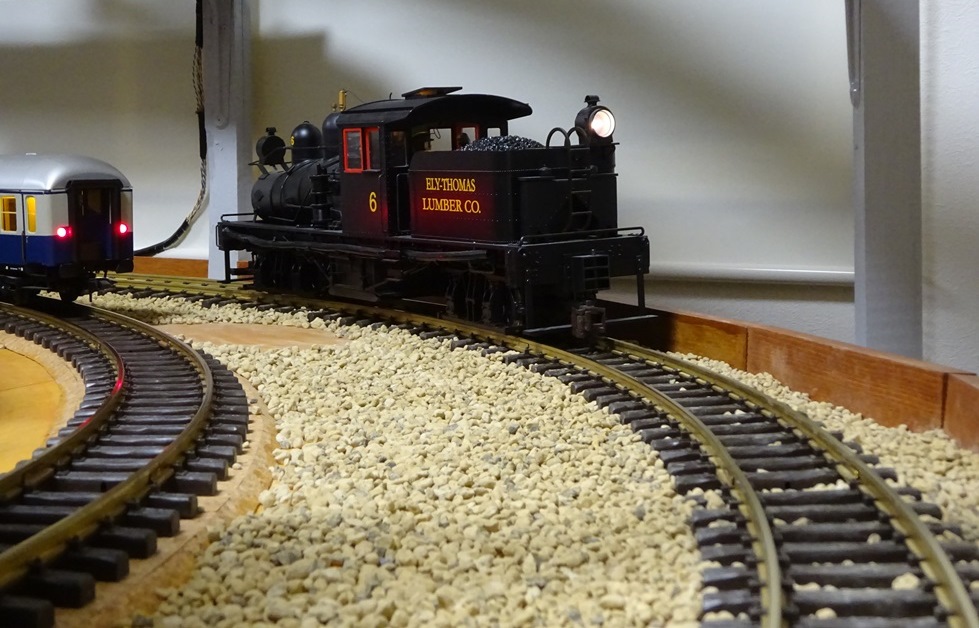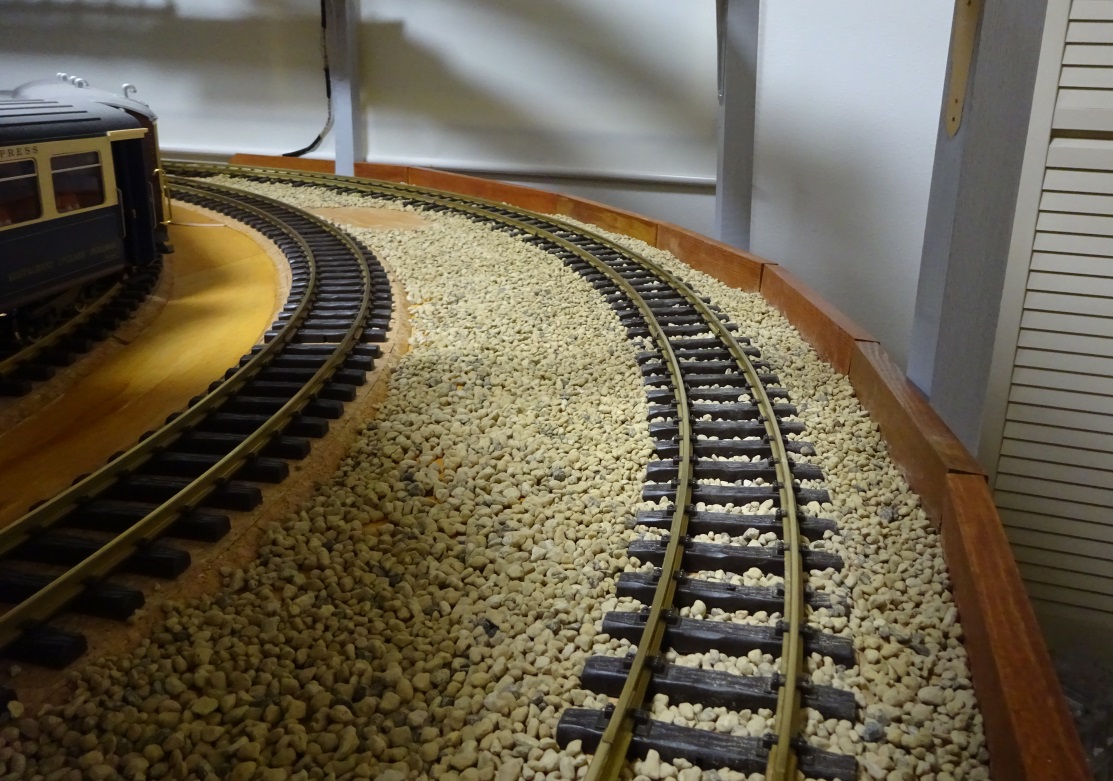 これ以上の曲線半径を作るにはフレキシブル線路を使うしかありませんが、最初に作ったレイアウトが組み立て式で、その路盤を現在の固定式レイアウトにも使ったので、そのまま利用しています。一応、曲線部には道床の外側に1mm弱の厚紙を敷いて、カントを作っていますが、緩和曲線はありません。